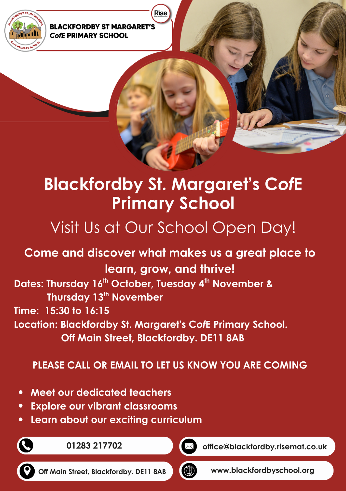 If you are thinking of moving your child(ren) to our school, in the first instance, please contact the school to arrange a visit via 01283 217702 or office@blackfordby.risemat.co.uk to enquire if we have places available in the relevant year group(s). We will offer you a tour of the school with a representative from our leadership team.
